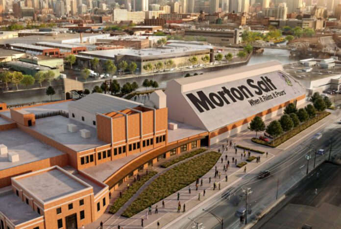 Morton Salt, Inc first announced the property would be redeveloped in early 2018. As part of the redevelopment agreement, 4.25 acres was sold to R2 companies for an undisclosed amount. The sale also guaranteed the retention of the Morton Salt-branded rooftop.