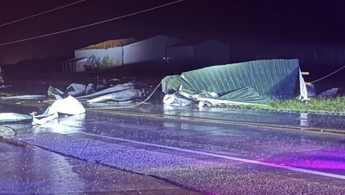In response to the damage, authorities closed a stretch of Route 45 near County Road 620N, as crews work to clear the scattered remnants of a large metal structure from the roadway.