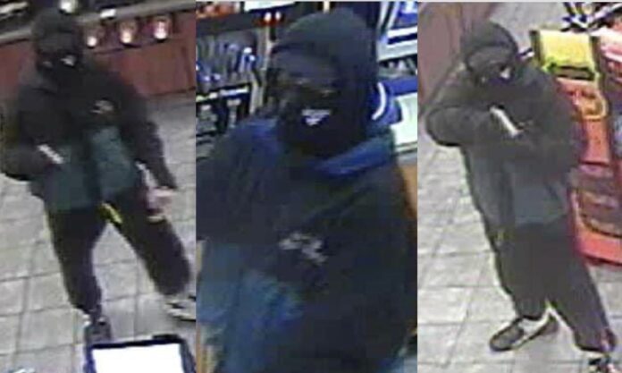 The suspect is described as a darker-complected male, approximately 5’10″ tall, aged 18-25, wearing a black and green hooded jacket, black pants, white/black gym shoes, and a mask. He was armed with a handgun featuring a silver slide and black frame.