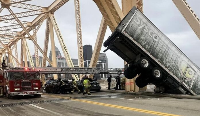 Louisville, KY – In a dramatic rescue, the Louisville Division of Fire performed a high-angle operation Friday to save a semi-truck driver whose vehicle was precariously hanging off the Clark Memorial Bridge today.