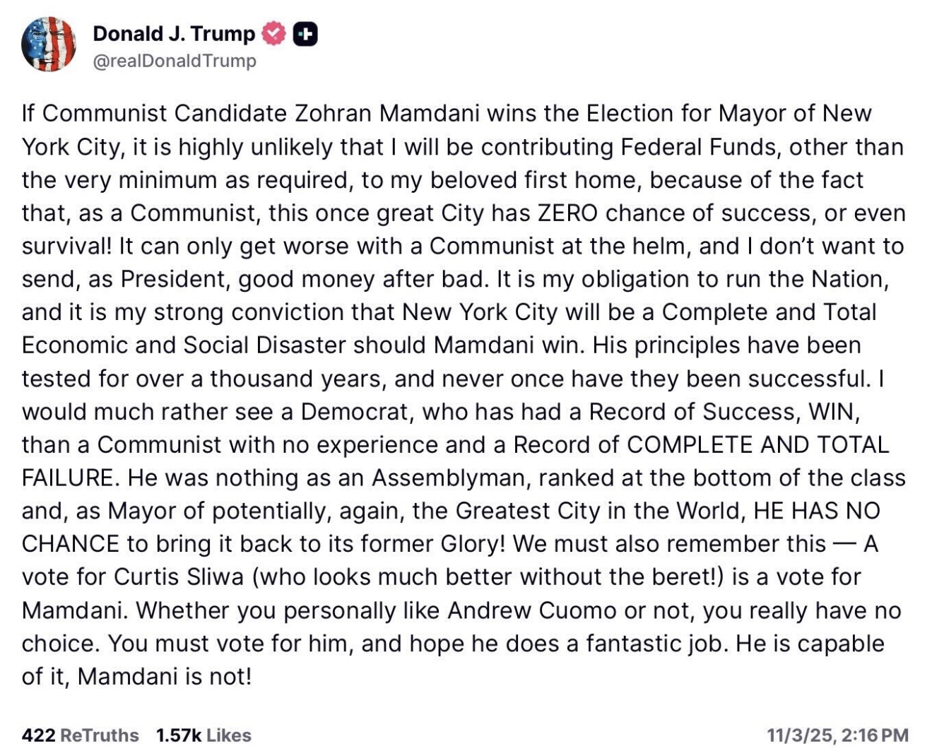 An AI-driven ethics analysis flagged a social-media post allegedly shared by former President Donald Trump as potentially “undemocratic and coercive,” after he appeared to threaten to withhold federal funds from New York City if voters elected progressive candidate Zohran Mamdani as mayor.