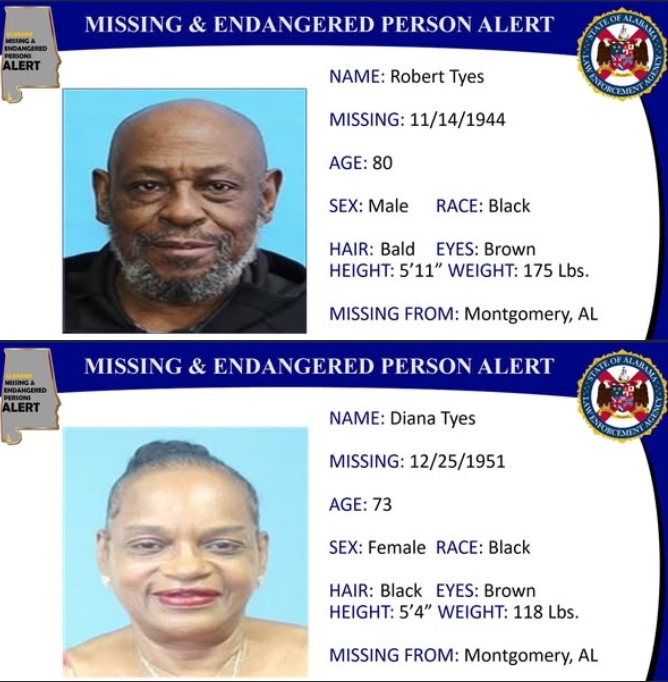 According to the Alabama Law Enforcement Agency (ALEA), Robert Tyes, 80, and Diana Tyes, 73, were last seen on Monday, September 30, 2025, around 9:00 a.m. in the area of Capstone Drive in Montgomery. Authorities say both individuals may have conditions that impair their judgment.