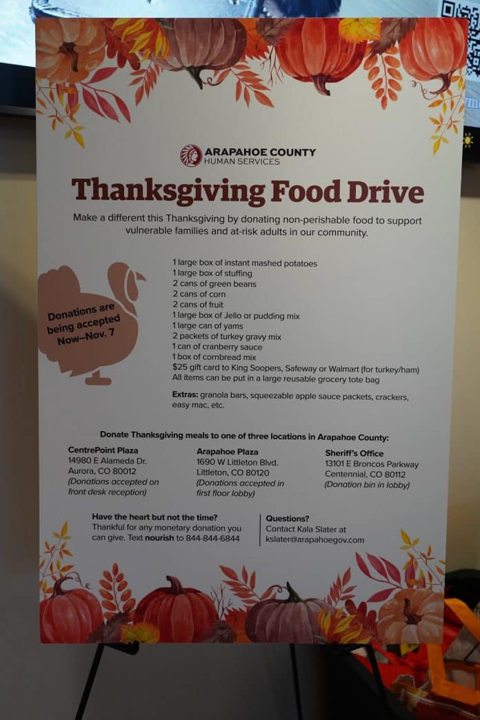 Officials say the effort directly benefits families who may otherwise go without a Thanksgiving dinner this year. More details, including a list of suggested donation items, can be found at arapahoeco.gov/ThanksgivingFoodDrive.