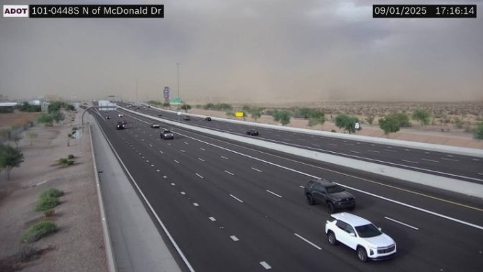 Phoenix, AZ – A powerful dust storm is sweeping across portions of the Phoenix metro area this evening, bringing dangerous travel conditions and strong winds.