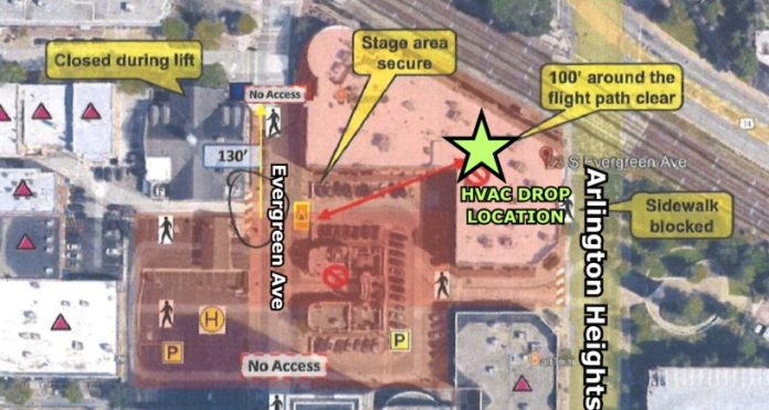 According to the Arlington Heights Police Department, a helicopter will deliver a large HVAC system to 23 S. Evergreen Ave., near the train tracks and Arlington Heights Road, at approximately 6:30 a.m. Thursday. The operation, approved by the FAA, is expected to last about 30 minutes.