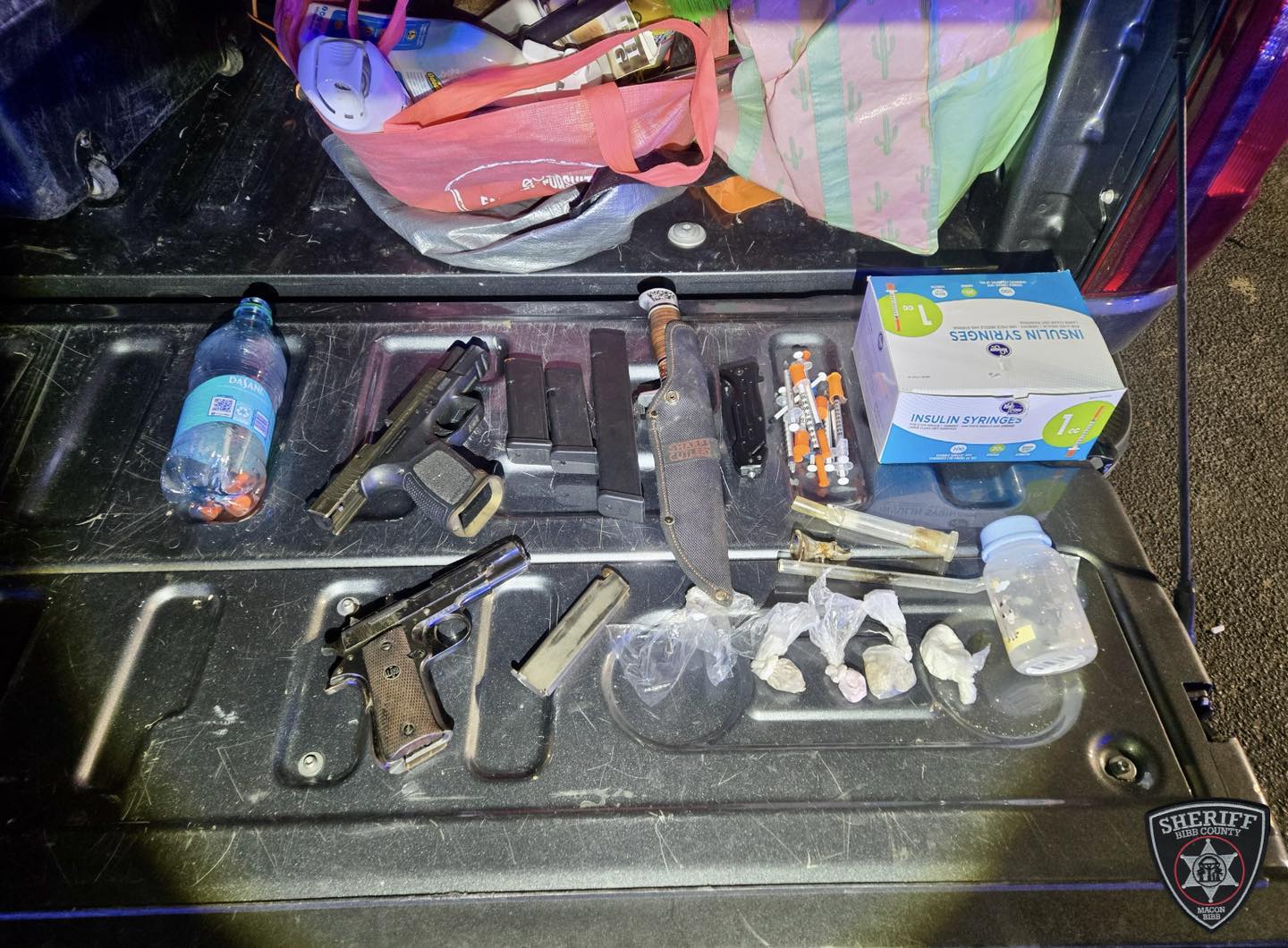 Deputies said a search of the vehicle was conducted based on probable cause. During that search, investigators allegedly recovered two handguns along with drug paraphernalia, including knives, syringes, glass pipes, and plastic bags containing what appeared to be heroin and other unidentified substances.