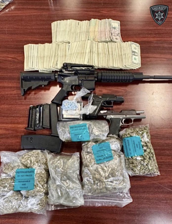 According to the Bibb County Sheriff’s Office, investigators found marijuana, ecstasy, digital scales, cash, ammunition, and a stolen handgun inside the residence. Photos shared by law enforcement show large amounts of suspected narcotics, bundles of U.S. currency, and several firearms displayed on a table.