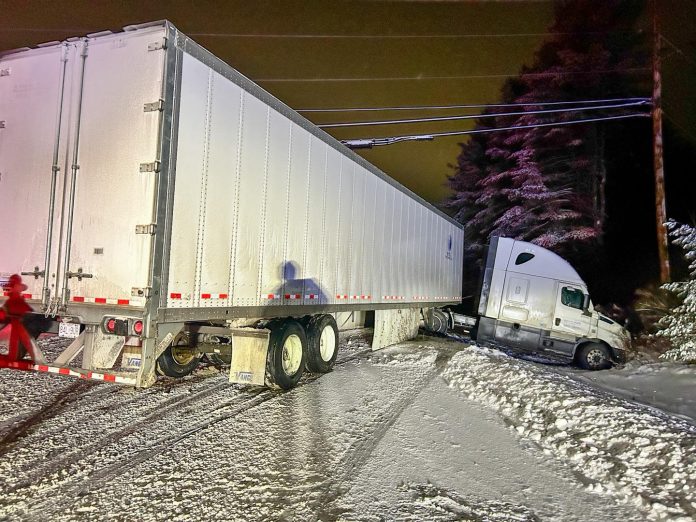 St. Johnsbury, VT – Drivers traveling through northeastern Vermont are urged to use caution today after a tractor-trailer slid off the roadway near Exit 21 and Route 2 in St. Johnsbury, prompting a response from Vermont State Police.