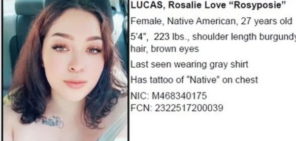 Lucas is described as 5’4″, weighing 223 pounds, with shoulder-length burgundy hair and brown eyes. She was reportedly wearing a gray shirt at the time she was last seen. Authorities say she has a tattoo reading “Native” on her chest.