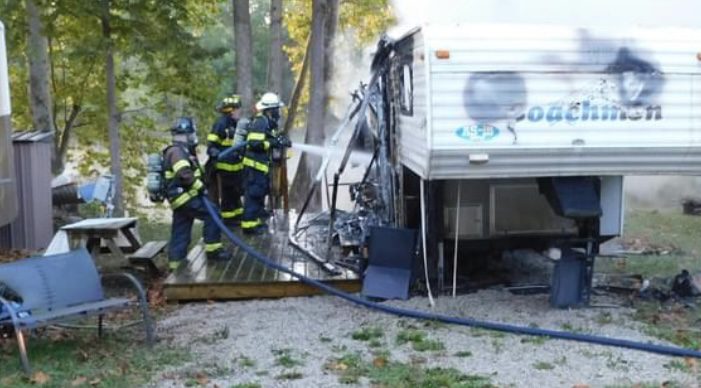 Cass County, IN – Public safety crews responded to a camper fire at Tall Sycamore Campground early this morning. Firefighters from Walton and New Waverly departments arrived on the scene to battle the fully involved fire. The camper was unoccupied, and no injuries were reported.