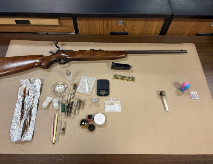 During the search, deputies reported locating suspected narcotics, drug paraphernalia and a firearm inside the residence. Further investigation determined the firearm had been reported stolen out of state, according to the sheriff’s office.