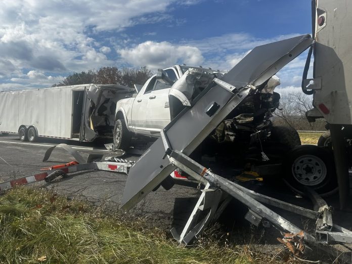 Afton, NY – Two people were hospitalized Thursday morning after a pickup truck towing a trailer collided with a Department of Transportation (DOT) work vehicle on Interstate 88 east in Afton, according to New York State Police.