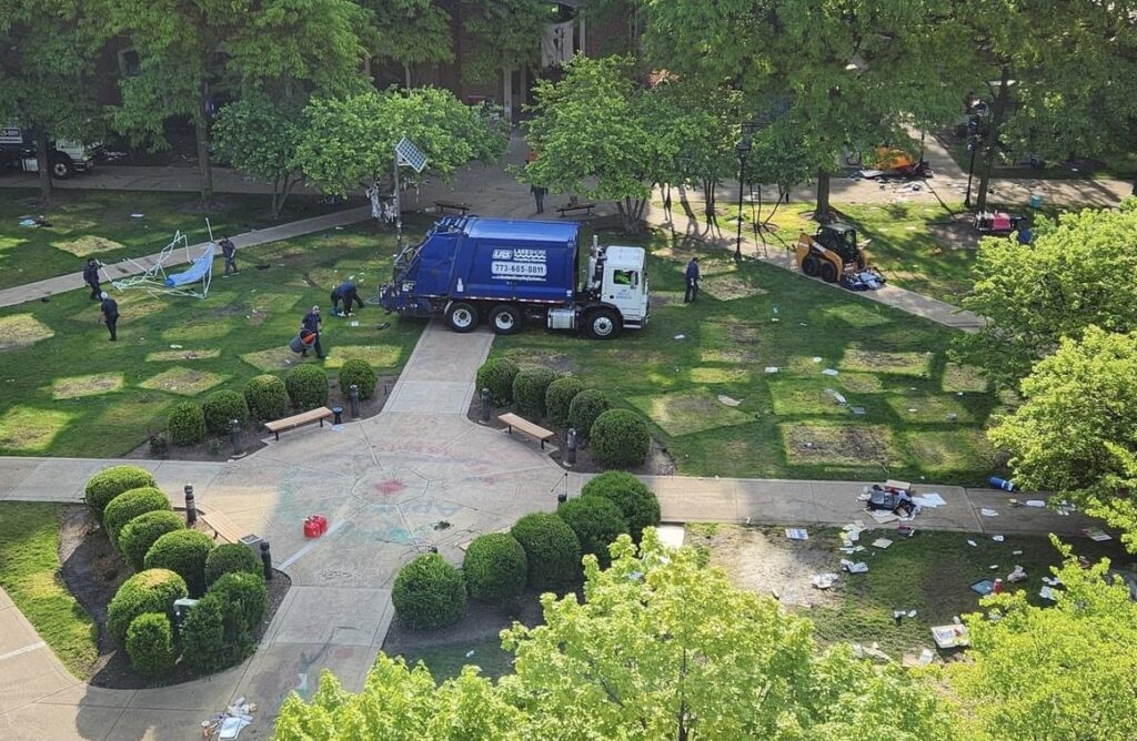 According to the Chicago Police Department, DePaul University signed a trespassing complaint today, prompting police and university administration to clear the encampment, which had been set up on April 30, 2024, in the 2300 block of N. Seminary. Despite multiple dispersal orders, two individuals remained and were subsequently arrested for obstruction of the roadway on W. Belden at 6:20 a.m. They have since been released.