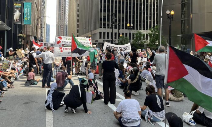 Chicago, IL – Nearly a dozen protesters were arrested Saturday afternoon after blocking Franklin Street in downtown Chicago during a demonstration in support of Palestine.