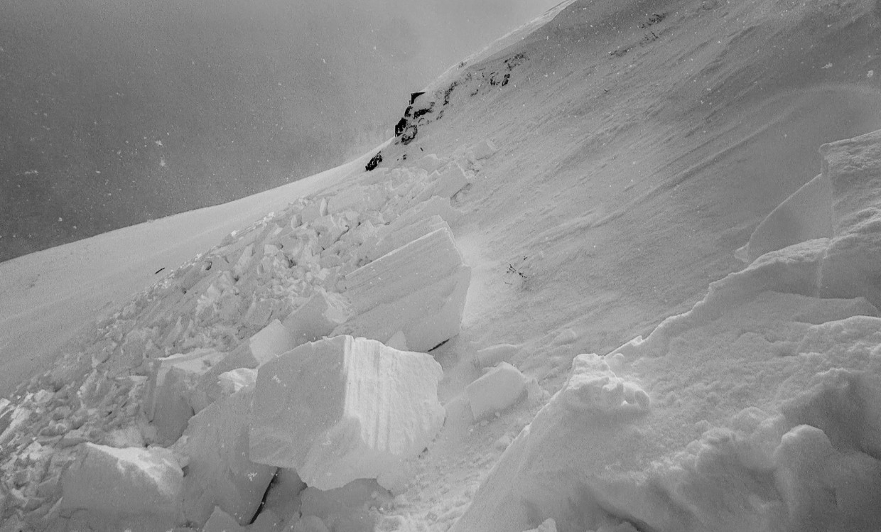 Images shared by CAIC show cracked, broken snow slabs on a steep mountainside, consistent with a wind slab release triggered by a person traveling through the area.