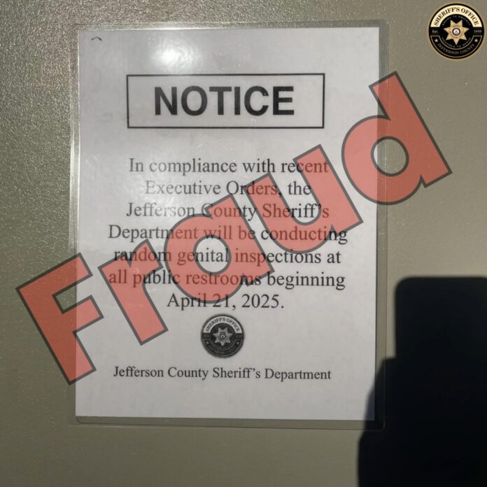 Jefferson County, CO – A fraudulent flyer posted in several park restrooms in Jefferson County has prompted a warning from the local sheriff’s office. The flyer, falsely claiming that the sheriff’s department would conduct “random genital inspections” at public restrooms, has been deemed a hoax.