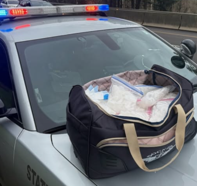 According to Oregon State Police, a trooper stopped a passenger vehicle traveling northbound on I-5 near milepost 168, just south of Cottage Grove, shortly before 11 a.m. Saturday, February 21. The trooper reported observing indicators of potential criminal activity before conducting a consent search of the vehicle.