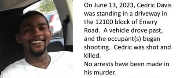 According to Crime Stoppers, Cedric Davis was shot and killed on June 13, 2023, while standing in a driveway in the 12100 block of Emery Road. Investigators say a vehicle drove by and its occupants allegedly opened fire, striking Davis. No arrests have been made in connection with the case.