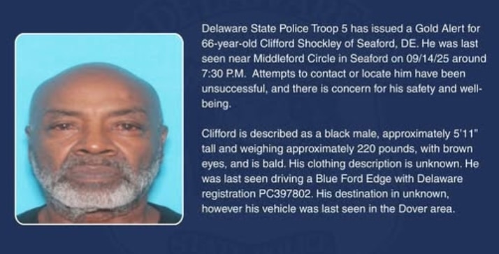 Seaford, DE – Delaware State Police have issued a Gold Alert for 66-year-old Clifford Shockley of Seaford after he was reported missing Sunday evening, September 14, 2025.