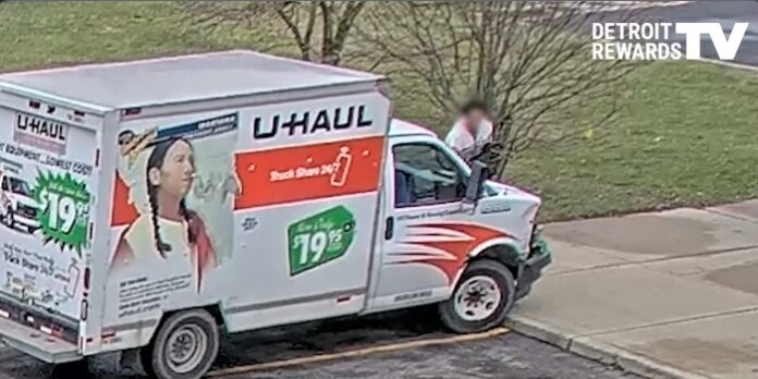 Police described the truck as a standard white U-Haul vehicle with the rate of “$19.95” prominently displayed on its side. The suspect’s face is partially visible in the video stills, and investigators hope public tips will lead to an identification.