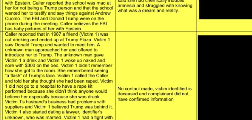 The records appear to include FBI interview summaries, known as FBI 302s, and National Tipline (NTOC) complaint logs documenting allegations made by tipsters and interview subjects connected to Jeffrey Epstein. Several entries contain graphic descriptions of alleged sexual abuse and trafficking, including references to alleged “measurements” of minors. Some allegations explicitly name former President Donald Trump, while others reference additional high-profile individuals.
