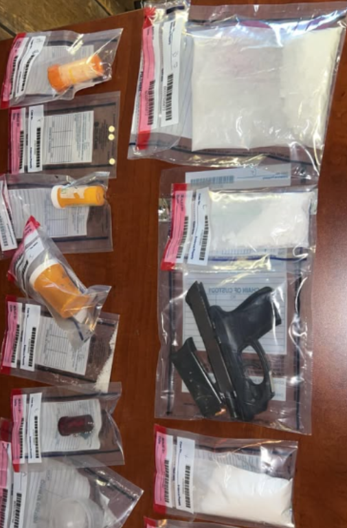 Investigators said the residence belongs to Patricia Myers. During the search, authorities reported locating approximately 70 grams of suspected cocaine, prescription pills, two grams of methamphetamine, a loaded 9mm handgun, and packaging materials allegedly consistent with drug trafficking. Officials also reported discovering a large amount of cutting agents allegedly used to mix narcotics.