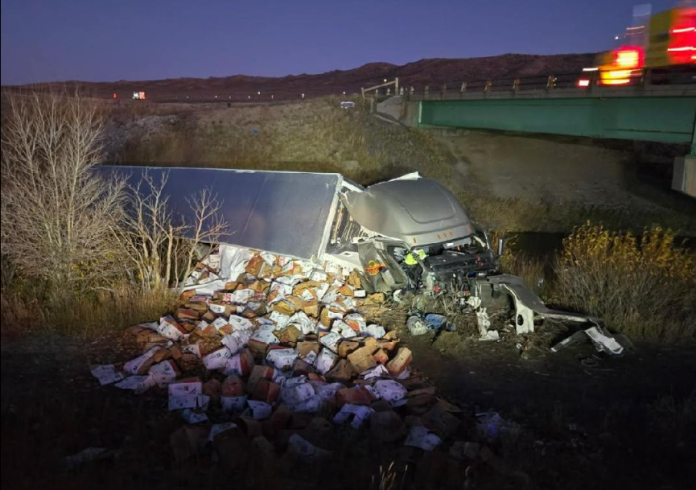 Elk Mountain, WY – A semi-truck hauling potatoes crashed into the Medicine Bow River early Monday morning, prompting a major emergency response and a DUI arrest, according to the Wyoming Highway Patrol.