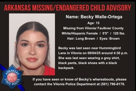 According to the Arkansas State Police, Becky Walle-Ortega was last seen near Hummingbird Lane in Vilonia around 4:30 p.m. Thursday. Officials said she was last spotted wearing a gray shirt, black pants and black shoes, carrying a black backpack.