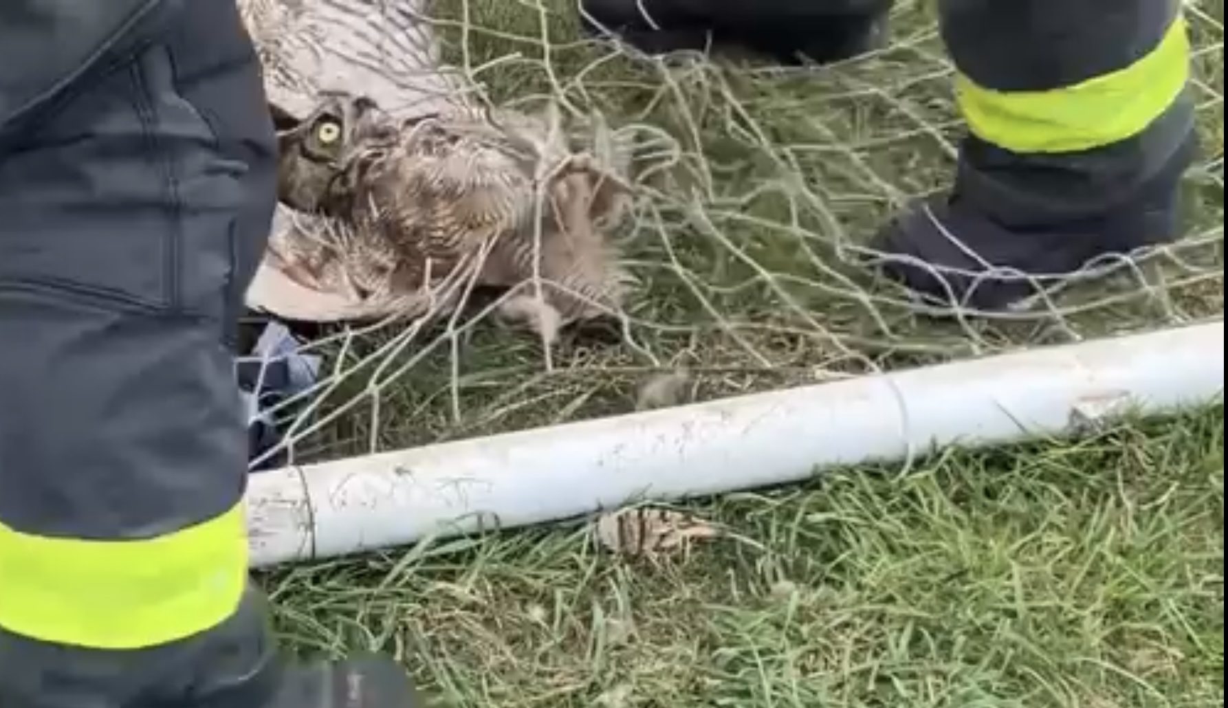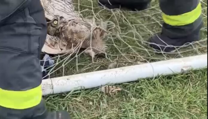 Indianapolis, IN – Firefighters from the Indianapolis Fire Department (IFD) successfully rescued a great horned owl trapped in a soccer net at Saint Francis Soccer Fields on Arlington Avenue. The incident occurred when a concerned citizen alerted the nearby IFD Station 35 crew about the owl’s predicament.