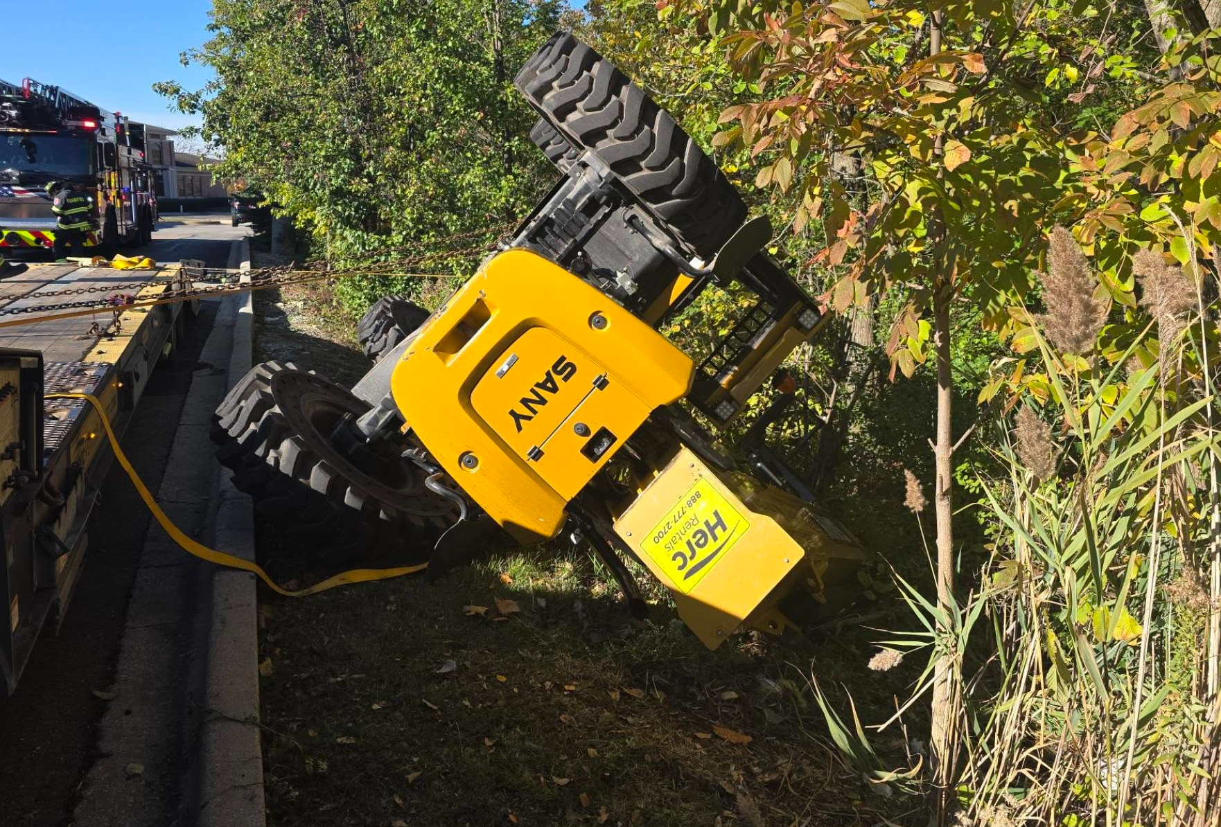 According to the Frankfort Fire Protection District, the incident occurred around 9:56 a.m. when the telehandler rolled off a flatbed truck while being loaded, coming to rest on its side in a ditch. Firefighters from multiple units — including Engine 75, Truck 71, Pumper/Tender 73, and Ambulance 75 — worked together to stabilize the heavy machinery and safely extricate the trapped operator.