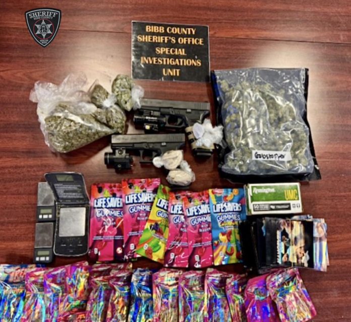According to the Bibb County Sheriff’s Office, the Drug Unit, Gang Unit, and U.S. Marshals Service executed the operation at the residence earlier today. Investigators reported that both individuals were wanted on multiple outstanding felony arrest warrants before the search began.