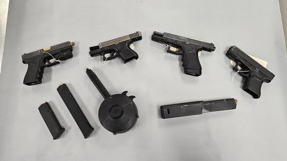 The sheriff’s office reported that firearms recovered during the stop were equipped with high-capacity magazines, including 30-round magazines and a 50-round drum. One of the pistols had allegedly been modified with a “switch,” converting it into a fully automatic weapon.