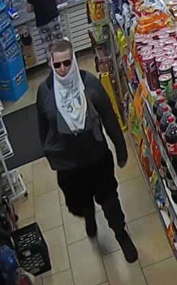 Surveillance images released by law enforcement show the suspect wearing dark clothing, sunglasses, and a light-colored scarf or cloth covering part of their face. Police have not released additional details about the suspect’s direction of travel or any possible vehicle involved.