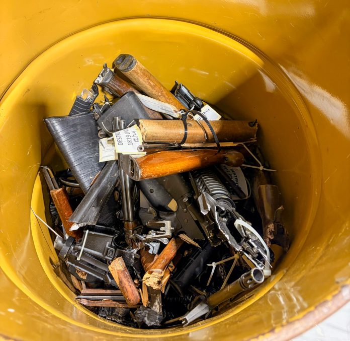 Photos shared by the sheriff’s office show deputies operating the industrial shear as it cuts through the metal frames of confiscated weapons, with large yellow barrels filled with destroyed gun parts.