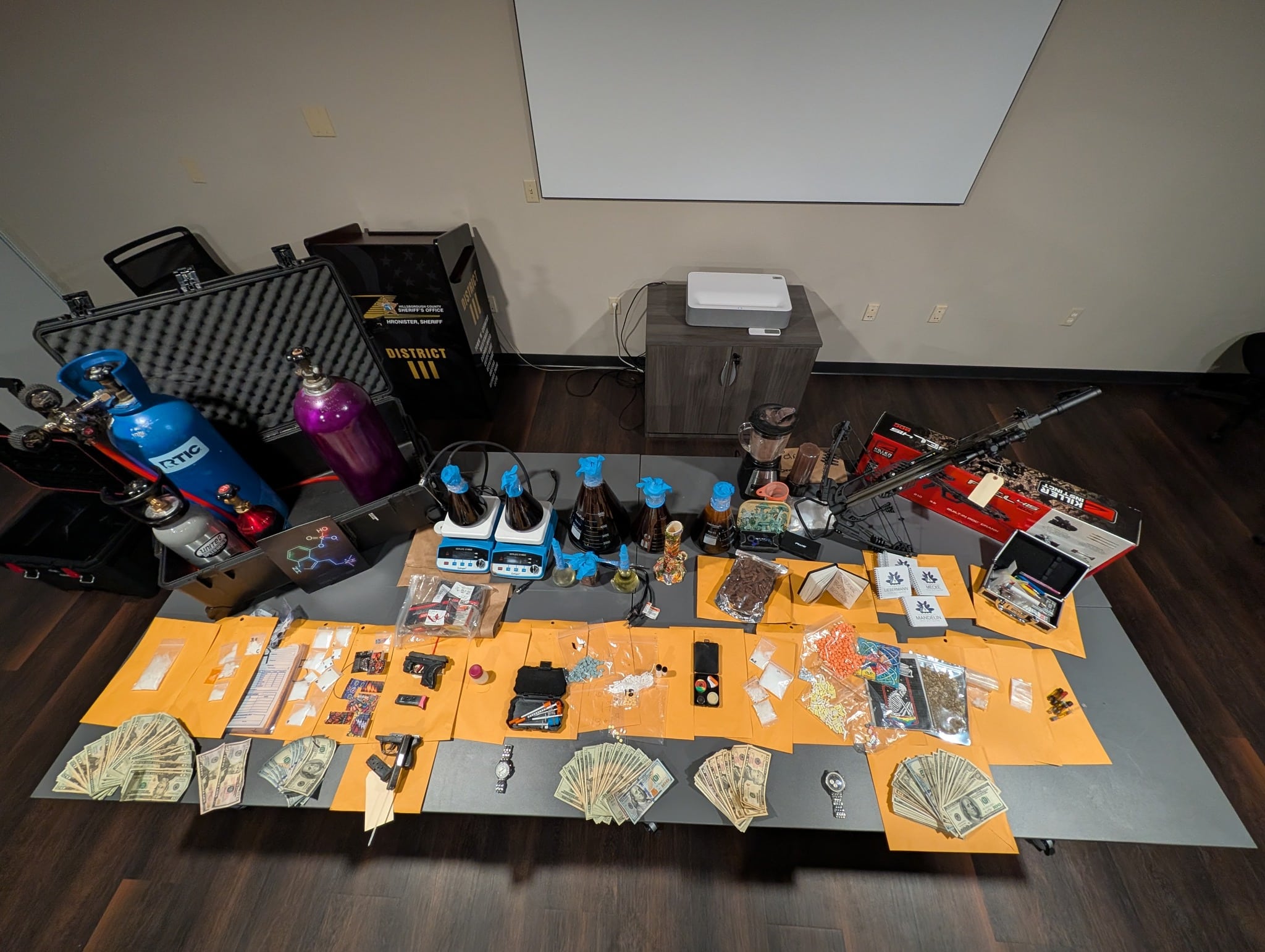 According to the Hillsborough County Sheriff’s Office, detectives executed the warrant as part of an ongoing investigation into suspected narcotics activity. During the search, deputies allegedly found a variety of illegal drugs, weapons and equipment consistent with an active drug-production setup.