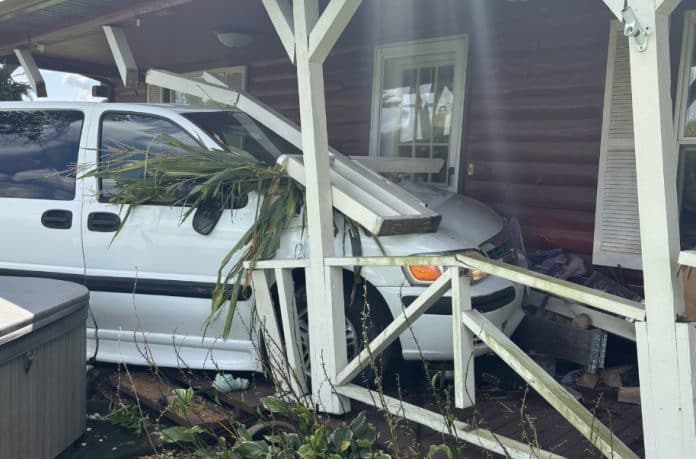 According to the Williamson County Sheriff’s Office, deputies were called to the 19000 block of Corinth Road around 11:04 a.m. after reports of a vehicle smashing into a residence. When they arrived, they found the vehicle wedged into the home’s porch, surrounded by splintered wood, damaged railing, and stalks of corn stuck in the grill.