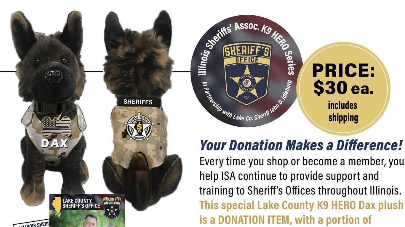 Proceeds from the $30 plush donations benefit the Lake County K9 Unit, supporting law enforcement efforts across Illinois. Each plush features a camo tactical vest, sheriff collar, and includes a commemorative trading card. For more on Dax’s career or to support this initiative, visit the Illinois Sheriff’s Association’s website.