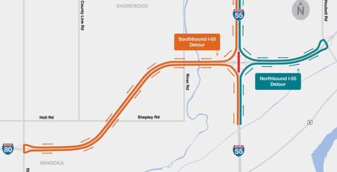 Traffic will be detoured using posted routes, with southbound drivers directed onto I-80 west toward Minooka before looping back to I-55 south, and northbound drivers rerouted onto local roads before rejoining the interstate. Motorists are urged to expect delays, allow extra travel time, and plan ahead.