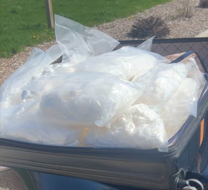 According to Illinois State Police, the stop happened just before 1 p.m. on eastbound I-74 when a Troop 5 Criminal Patrol officer pulled over a passenger vehicle in McLean County. A search of the vehicle uncovered multiple packages of suspected methamphetamine weighing approximately 97 pounds, with an estimated street value of $3.6 million.