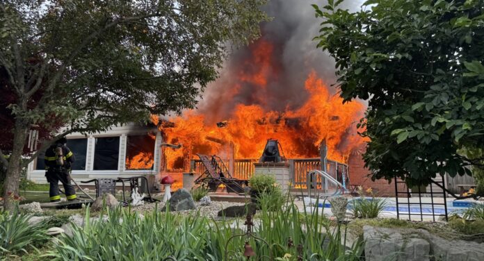 Firefighters were forced to evacuate and regroup after the home’s vaulted ceiling collapsed inside the family room, causing debris to fall on several responders. Despite the hazards, the blaze was brought under control within 35 minutes.