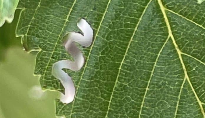 According to the Indiana Department of Natural Resources (DNR), the elm zigzag sawfly (Aproceros leucopoda) attacks both native and introduced elm species (Ulmus spp.). The pest feeds exclusively on elm leaves from April through October, leaving behind a distinctive zigzag pattern in the leaf tissue. DNR reports that the insect appears to infest roadside and open-area trees more often than forest trees.