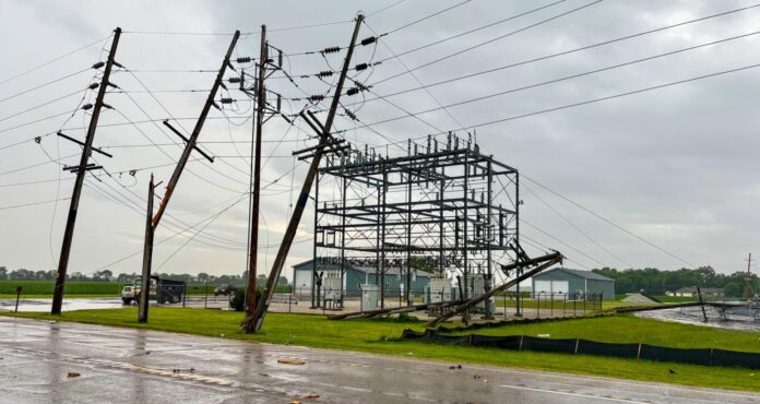 Photos shared by the sheriff’s office show downed poles leaning dangerously over the roadway and a nearby electrical substation with damage in the surrounding area. Wet conditions and scattered debris from the storm have added to the hazards at the site.