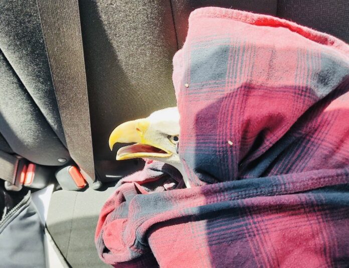 In a tweet by Sergeant Matt Ames, the trooper reported carefully placed the eagle in his patrol car and took it to a local veterinarian. The tweet did not specify when the eagle was found, but it did show a photo of the bird wrapped in black and red plaid cloth.