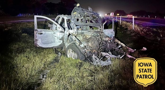 The crash occurred around 7:38 p.m. near the 149-mile marker east of Mitchellville, when a 2008 KIA Sorento traveling westbound crossed the median at a crossover and struck the cable barrier before entering the eastbound lanes. The KIA then collided head-on with a Kenworth semi-truck, causing both vehicles to veer off the roadway and become fully engulfed in flames.