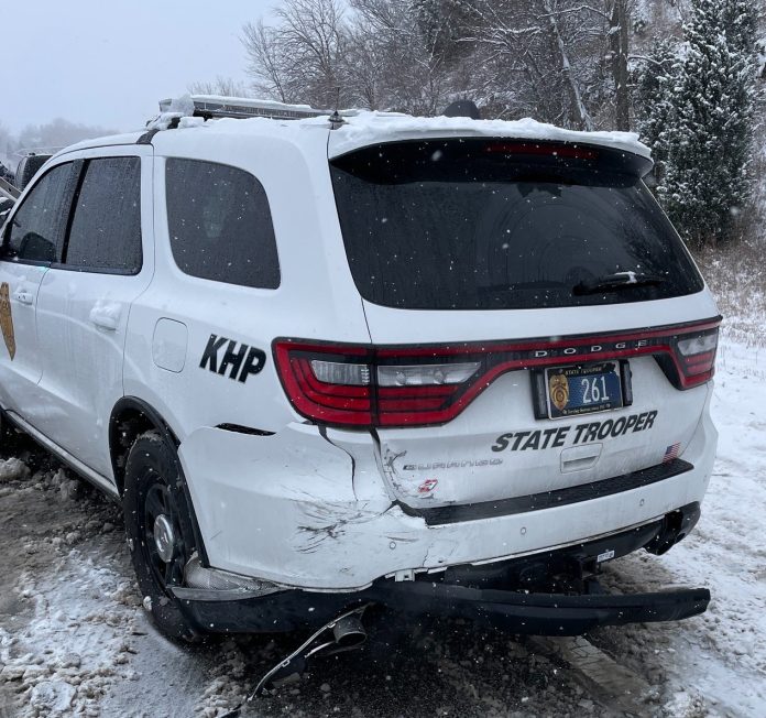 According to the Kansas Highway Patrol, the incident happened yesterday while the Trooper was working a separate crash on I-435. His patrol vehicle was parked on the right shoulder with emergency lights activated when a passing vehicle crashed into the cruiser. Officials said the Trooper was inside the vehicle at the time.