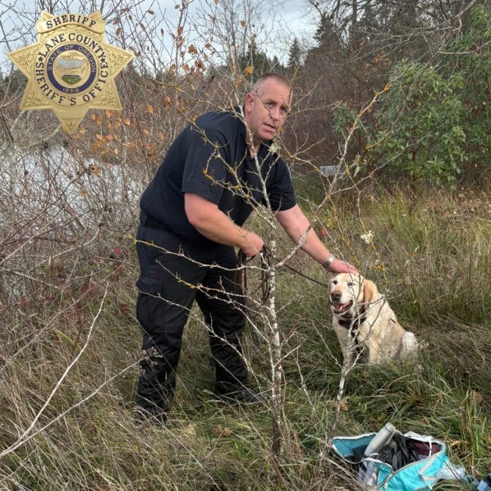 A deputy reviewing neighborhood security footage spotted the woman near Kirk Pond, prompting teams to focus their efforts there. Within minutes, Oregon State Trooper K9 Buck tracked the woman to the pond’s edge, where rescuers found her almost completely underwater.