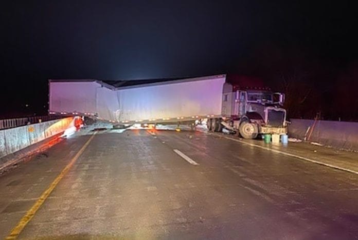 A commercial vehicle wreck late night ended with I-57 being blocked for several hours by a semi tractor trailer near Chebanse. The Semi suffered significant damage that left the vehicle hanging over the wall.