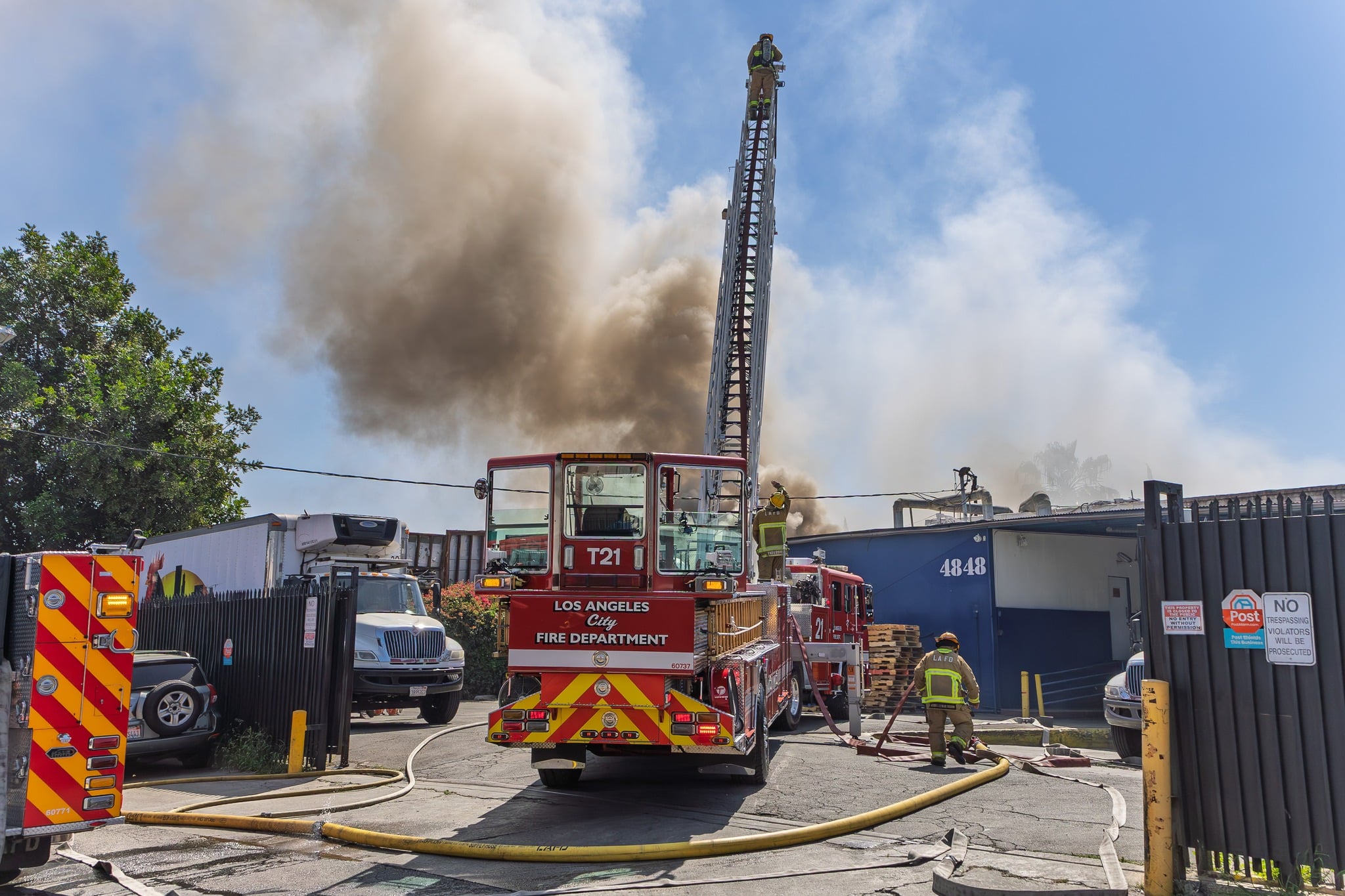 According to the Los Angeles Fire Department, crews responded around 11:23 a.m. Friday to a fire at 1820 E. 48th Place in the Central-Alameda area. The blaze involved burning metals in an exterior yard, creating thick plumes of smoke visible from surrounding neighborhoods.