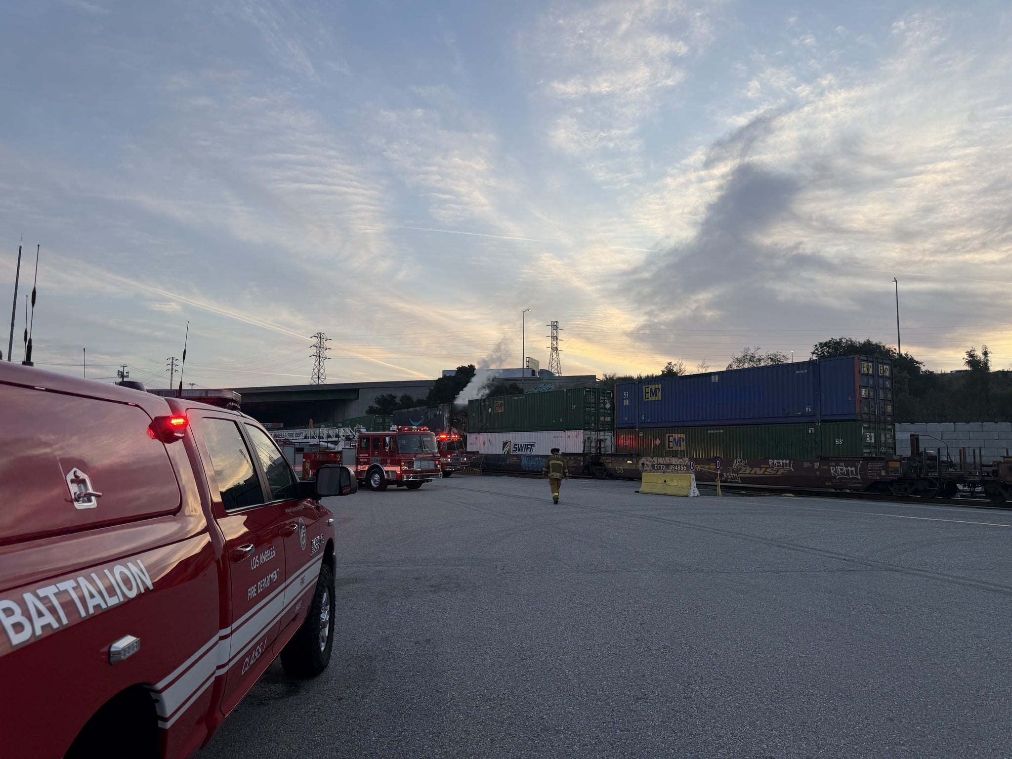 According to the Los Angeles Fire Department, crews were dispatched at approximately 5:19 a.m. after receiving reports of a fire inside a container on a moving freight train. Officials said the train was allowed to continue traveling until it reached a designated secure rail yard, where firefighters could safely access the scene and connect to a stable water supply.