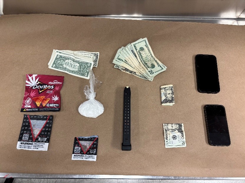 While conducting an inventory search prior to towing, deputies allegedly located approximately 3.5 grams of suspected cocaine inside the vehicle. Authorities also reported finding a 30-round Glock magazine loaded with 21 rounds of 9mm ammunition, along with $694 in cash, two cell phones, and marijuana and tobacco.
